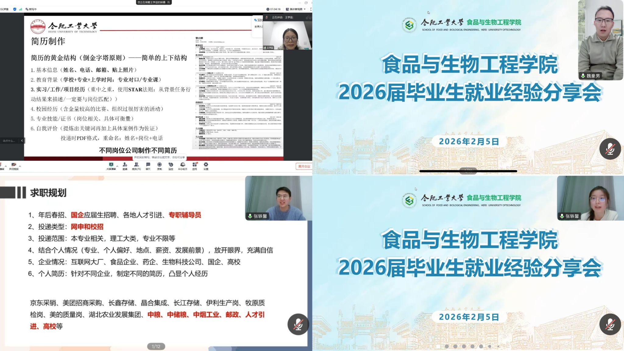2月5日19:00,食品與生物工程學(xué)院召開(kāi)2026屆研究生線(xiàn)上就業(yè)經(jīng)驗(yàn)分享會(huì),精準(zhǔn)對(duì)接畢業(yè)生求職需求,幫助同學(xué)們明晰求職路徑、積累實(shí)戰(zhàn)經(jīng)驗(yàn),進(jìn)一步推動(dòng)畢業(yè)生高質(zhì)量充分就業(yè)。2026屆、2027屆研究生參會(huì),輔導(dǎo)員張軼馨主持。會(huì)議伊始,學(xué)院黨委副書(shū)記兼紀(jì)委書(shū)記李艷結(jié)合當(dāng)前行業(yè)發(fā)展新形勢(shì),分析了2026屆就業(yè)市場(chǎng)的整體態(tài)勢(shì),強(qiáng)調(diào)研究生應(yīng)保持積極的求職態(tài)度,拓寬就業(yè)方向,既要主動(dòng)把握校招、公考、國(guó)企招聘等關(guān)鍵機(jī)遇,也要理...